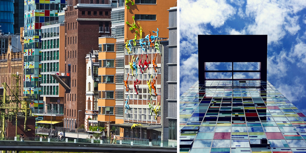 Svjetski poznati muzeji poput muzeja "Kunstsammlung", predivne zgrade u baroknom stilu poput crkve Sv. Andreje, čuvena "Kö" ulica visoke mode i "Burgplatz", gradski trg sa kulom starog zamka koja gleda na Rajnu, čine Diseldorf željenom turističkom destinacijom u Njemačkoj. Rajna dijeli ovaj grad na dva dijela. Nedaleko od Starog grada, u luci Diseldorfa, Medienhafenu uzdiže se postmodernistička arhitektura. Nekadašnje stare radnje pretvorene su u futuristički moderne zgrade koje se odlikuju originalnošću i elegancijom.